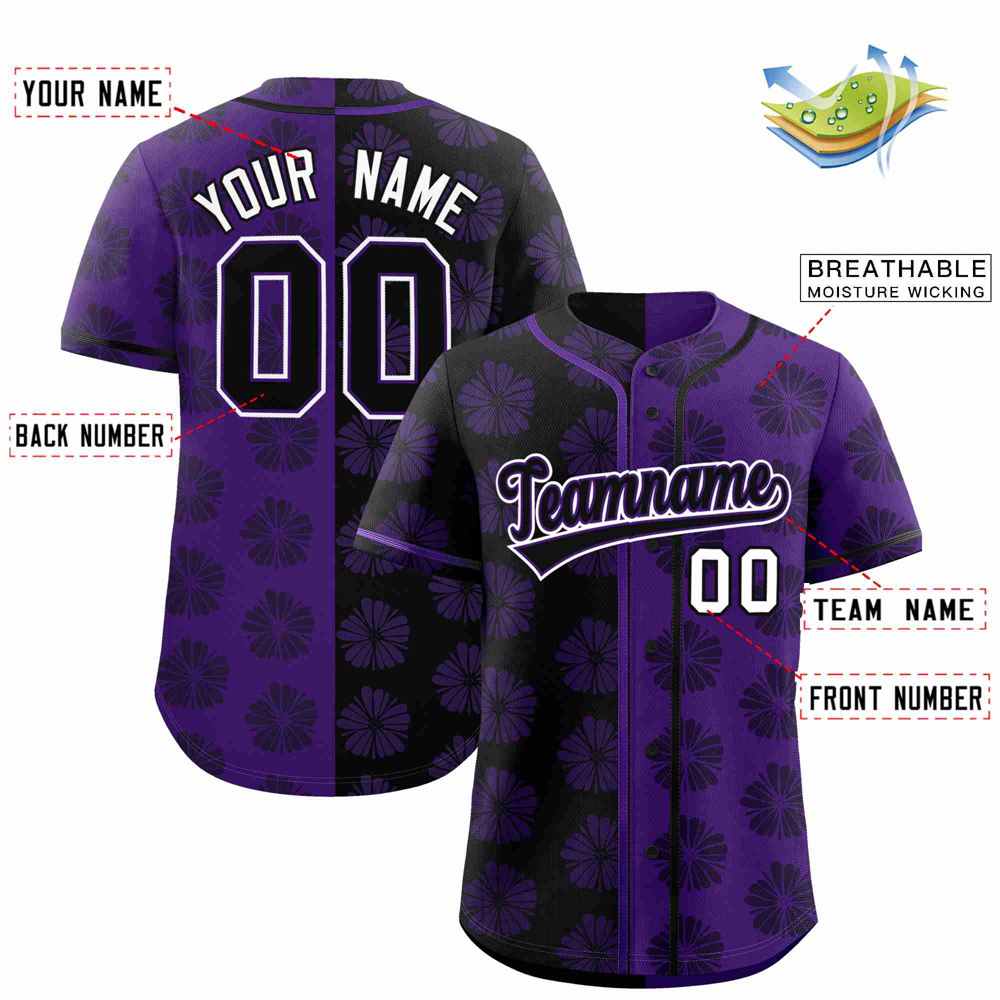 Custom Black Purple Split Fashion Flower Graffiti Pattern Authentic Baseball Jersey